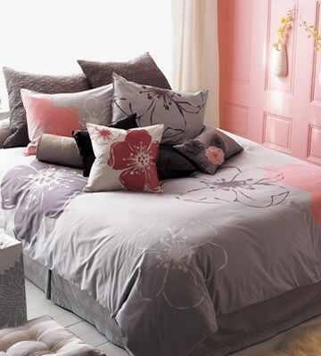 绯红与粉红,将花朵绽放在床品的局部。灰的背景与白的调和,使娇媚的粉趋于雅致。立体花朵装饰靠垫,粉墙上黄色插花,让外面的生机蔓延至屋内。