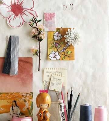 剪一朵樱花和几幅图片,与新鲜的花枝和涂鸦的画一起钉在墙上,新鲜的创意折射出灵气,日式瓷娃娃和两个线圈非常讨巧,甜美可爱中透着细腻和质朴。