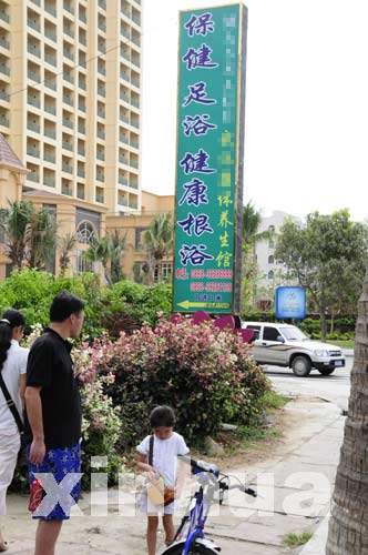 在游客众多的三亚著名景区三亚湾附近,“根浴”广告牌竖立在街头。