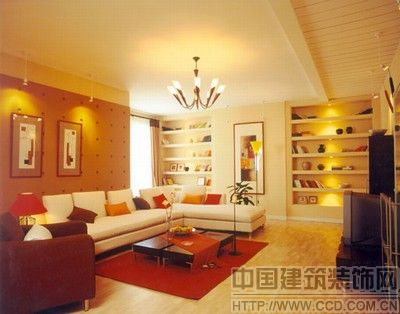 客厅的三面墙用淡黄色乳胶漆处理,家具的选择以白色为主,配以红白相间的沙发。因为客厅面积较大,所以选择了宽大的多人沙发,与旁边的单个沙发椅形成了L形布局,沙发后面的墙壁设计了反射灯作为局部光源,沙发与电视柜的距离较远,这样无论是休息还是观看节目都非常舒服。