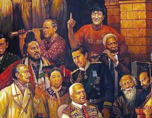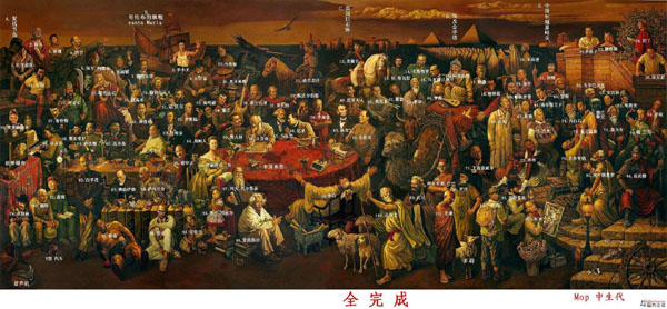 戴都都:我2006年春节过后和两位朋友花了前后将近一年的时间画了这幅画,而构思多年前就有。1999年,我画了一幅画叫《中国故事》,也叫《老李头儿的文物店》,利用“文物店”画了几百个中国文物,每个文物都讲述了一个中国故事。这幅画获得了当年文化部艺术大奖的金奖。之后我想像讲中国故事一样讲世界历史,于是就想通过把对历史起重要作用的伟大人物超时空地放在一起构成世界历史。