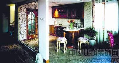 由于厨房门前的空间较小,如果使用墙体或其他厚重材质将其与门厅分隔,难免会使此空间显得太压抑,因此使用了金色镂空铁艺作为隔断。和屋内实木整体厚重的感觉相比,铁艺产品借鉴欧洲古罗马时期纯朴、质感的加工工艺,与现代精湛的锻造手段相结合,制造出具有欧洲古典风格且蕴涵现代气息的隔断,既有效地区分了功能区,又充满轻盈通透的美感,而且铁艺的质感、线条、造型与居室整体的欧式风格也非常协调,并且使厨房门前的狭小空间也得到了充分利用,成为一个西式餐区。