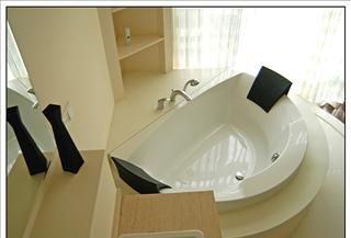 随着水流的不断循环、喷冲,仿佛一双温柔有力的手在疲劳的身体上点压按捏,引领着你躺上一张温暖“水床”。浴缸的造型不再是传统的椭圆型,出现了如圆形、心形、扇形、钻石形等等。浴缸内部也不再是一片空荡荡的白瓷世界,靠垫、扶手以及各种贴合人体**的设计,使浴缸看起来如同一件精雕细镂的艺术品。