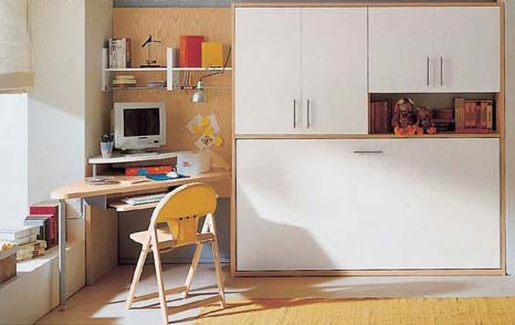 ■ 床头板是可以拆卸下来的,这样在床收起来的时候不占用空间,这可让房间成为一个完整的书房。