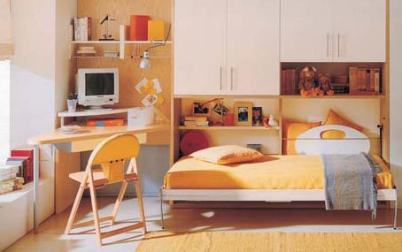 ■ 变化范围广:床铺的尺寸为940厘米X200厘米,完全能够满足成人使用标准。而且书桌椅也是可伸缩调节高度的,所以可适合各个年龄段的儿童使用。由于家具使用的浅蓝色与白色为中性色,没有明晰的性格取向,所以也就很容易通过床单和其他小物件的搭配来营造适合不同年龄段、不同性别儿童的居室风格。如绿色、橙色、黄色就比较适合男孩子的房间,而紫色,橙红色就比较适合女孩子的房间。