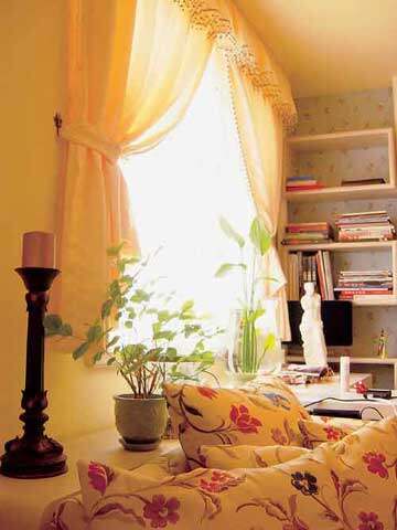 窗台的绿植与沙发的花朵图案,笼罩在鹅黄色纱帘下的柔和阳光里,绽放一室的温馨芬芳。