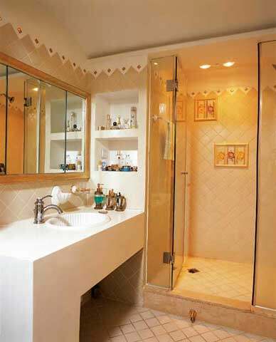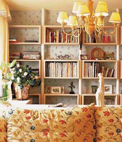 最值得玩味的是,各种花朵元素被精心安排在各处,巧妙地呼应着居室的主题。同样的蓝色壁纸上对比运用了田园风格的枝叶繁茂的大团花与清新简洁的小碎花;白色的书柜特意选择了无背板的设计,可以透露出壁纸的花色,在细节的微小之处更体现了空间延伸的概念;鹅黄纱幔上的淡雅提花和白底沙发上的红、蓝花朵又与房间主色和谐一致;甚至在浴室的墙面和门上都不忘装饰上花朵元素;更有花瓶中绚烂的蓝、白花卉点缀其中,营造出犹如梦幻般的私家花园的居室,一切都令人感觉那么惬意、愉悦。