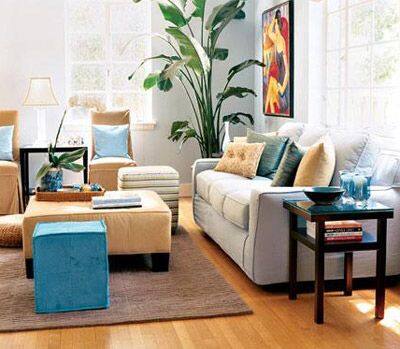 很多人喜欢在沙发范围内摆放一块华丽缤纷的大地毯,既可增添美感,同时又可突出沙发在客厅中的主导地位。