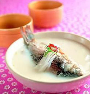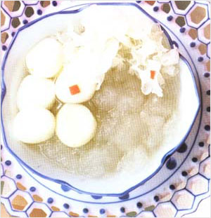 [做法]白鲫鱼宰洗净,慢火煎至微黄,溅入少许清水,铲起;鸡蛋煎为荷包蛋状,铲起;起油镬爆香姜片,加入清水1250毫升(5碗量),武火滚沸,下白鲫鱼滚片刻,下荷包蛋,滚沸后撒入适量食盐、胡椒粉便可。