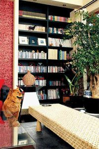 充分利用空间是选择和搭配家具的首要目的。在此书房空间内,业主靠墙设置从上到下的大书柜,满足藏书的需求。中间则放置了一张造型简单的藤质矮脚长桌。再配以色彩、造型都很简洁的黑色沙发、玻璃茶几等,在满足实用的阅读休闲需求的同时显示了主人的性格爱好。