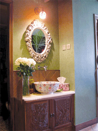 在这个独立的洗手台前,洛可可风格的铜镜上方用了一盏小小的花形灯作为镜前灯,与小花图案的洗手盆相呼应。镜子反射光线,以此来增强居室的空间感,很大程度上缓解了人对于狭小空间的恐惧感。并且,柔和的黄色灯光与深绿色的壁纸、深咖啡色的卫浴柜搭配在一起,整个色调显得丰富而不突兀,很有艺术装饰性。