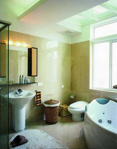 卫生间的设计基本上以方便、安全、易于清洗及美观得体为主。由于卫生间的水气很重,内部装潢用料必须以防水材料为主。浴室的墙壁和天花板所占面积最大,所以应选择既防水又抗腐蚀和防霉的材料来确保室内卫生,瓷砖、强化板和具防水功能是塑料壁纸都能达到这些要求。天然石料如大理石则具有特殊的质感,但可异在狭小的卫生间内发挥不了效果。