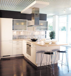 偏冷的颜色是简约主义的代表色。简约厨房所使用的原木色有两种,一种是采用实木不进行着色,另一种是采用原木纹理的高档防火板。原木色能够体现木材本身的自然美感,突出家具的设计。白色是简约主义的一种永恒颜色,简约厨房中运用白色,可以把看似狭小的空间以一种透视的效果达成纵深感。同样黑色也是简约厨房的一个常用色,但由于颜色过深,所以在厨房中很少会有大面积、整体的黑色,而是偏向于时下非常流行的黑胡桃木色为代表的深褐色,作为一种点缀色出现。