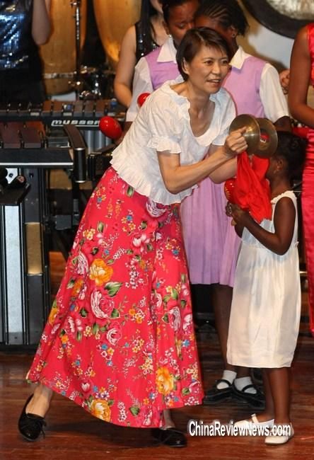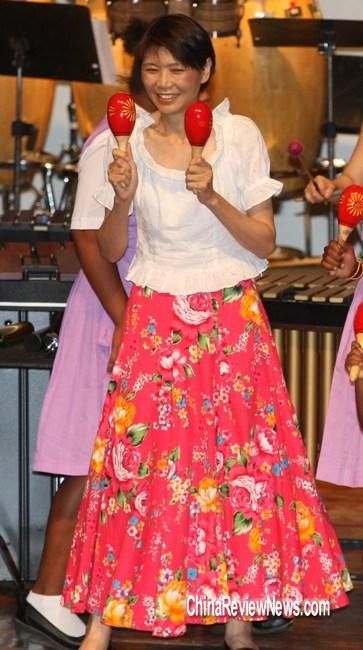 周美青28日(当地时间)观赏打击乐团表演时,上台同乐,一连玩了4种乐器,并配合节奏韵律摇摆,热力四射。