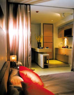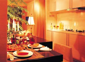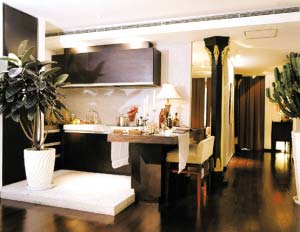 2.厨房就在客厅旁,用一个颇有个性和意境的屏风分隔,既节省了空间,又调动出整个房子的味道。