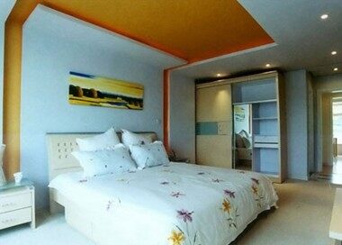 目前,房间的净高普遍比较低,约在2.50到2.80米之间。为了不致产生压抑感,在顶部处理上以简单为最好。从人的视觉习惯上来讲,房间的顶部是最不被重视的地方,所以也没必要做得太复杂。