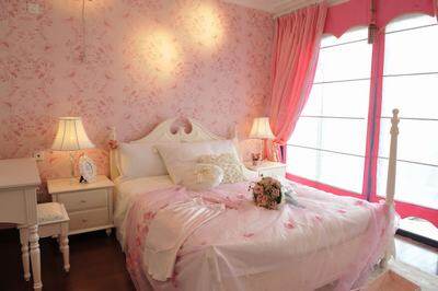 韩式田园风格可能是大多数年轻女孩比较喜欢的,它的重要元素是色调以柔和浪漫 的粉色为主,浪漫的蕾丝、绿色的植物、经典的白色家具、随处可见的卡通娃娃 、毛绒地毯等装饰。