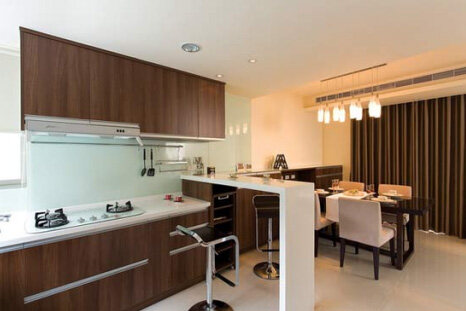另外,厨房中总有些小角落,折叠或长度可调节的连柜餐桌可以充分利用这些小角落,而且上面做餐台,下面还可以做推拉式高柜,这种储藏能力很强的柜体大大减少了对空间的需求。如果是开放式厨房,将料理台延伸出来做成小酒吧也是不错的构思。