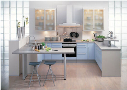 由于二次装修的厨房面积一般都比较小,所以更适合一字型和L型的橱柜。一个完整合理的厨房是由洗物区、料理区、烹饪区组成,是一个舒适便利的三角工作区。长方形的厨房较常见,大多数家庭在橱柜设计时都采用了简单的L形,使洗涤区、操作区及烹饪区都设计在一条直线上,操作起来非常方便。