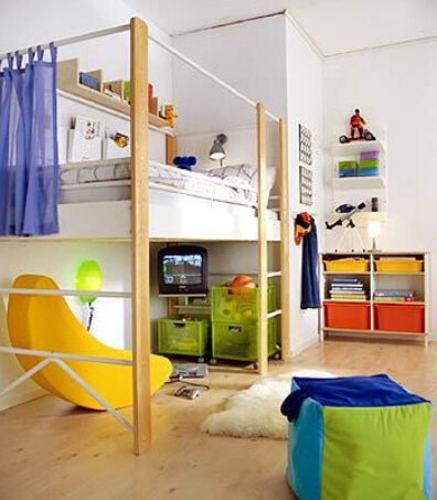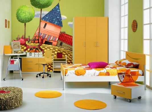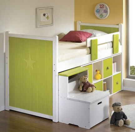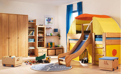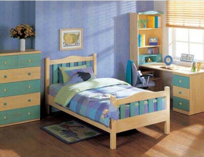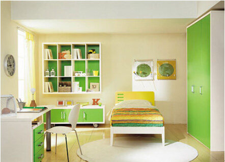 学龄前的房间中,为保证孩子的身体健康,儿童房中的家具都选用环保的实木家具,并铺设实木地板。因为孩子年龄小,又好动,宜选用低矮的儿童床,以免孩子睡觉时“不老实”而翻下床。