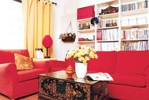 屋里最大的一件家具摆放好了,剩下的布置就好办了。小卧室只能摆下一张床和梳妆台,电视柜和小型电脑桌摆在了大衣橱的同侧。红色沙发后面是一溜很薄的宜家书橱,上面摆满了杨杨的书籍和宝贝,书橱下面还有储物空间。这样一来,客厅和卧室的功能就被明确地区分开了。