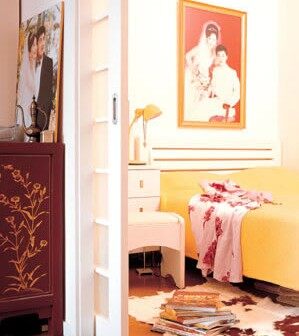 虽然这种布局不够通透,但这些分隔都是适合现在生活状态的必然选择。白色家具配合黄、红、棕色的点缀,营造出浓浓的新婚气氛和温馨感。