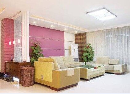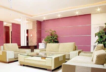 紫色背景墙最常用的地方是沙发背景墙。用紫色壁纸大面积铺帖,只在柜式空调的后面留出相应的白色部分,再用银色金属条横着粘贴在壁纸上,既能保证整体色调的完整,又不会死板,而且银色也是一种很高档的颜色,整体看来很有品位。值得注意的是家具一定要选择浅色的,不然客厅就会显得很暗。