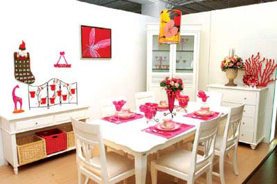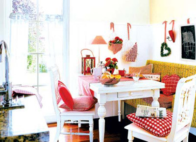 方案三:色泽鲜艳的布艺饰品也会提升餐厅的圣诞指数,粉红色的餐布、格子餐垫、餐巾、温暖的靠垫或墙上的布艺挂饰等都会烘托出考究浪漫的品位。