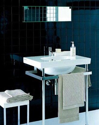 和面盆下的毛巾杆风格相近的小方凳,放置在面盆旁,可放置较大的浴巾或洗浴时换下的衣物,和面盆下的毛巾杆风格相近的小方凳,放置在面盆旁,可放置较大的浴巾或洗浴时换下的衣物,而且因为风格统一,不会使梳洗空间感觉拥挤狭小。