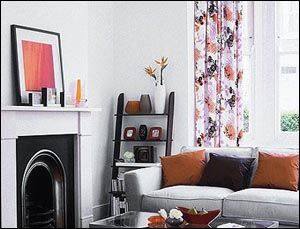 白色的墙面色彩清淡、简洁,对整体橙黄色调起到很好的中和作用,纯木地板让现代、轻盈的房间多了几分厚重。白底橙、黑、灰三色花纹的窗帘在白色背景下显得别有风味。灰白色布艺沙发搭配数个橙色和棕色靠垫,宜家的长方小桌上是橙色石质花瓶、灰缸形花瓶和船形果盘,造型别致。壁炉架上画框内依然是橙色图画,和香蕉形黄色花瓶。墙角的架子上随意摆放着橙、白、青灰色花瓶和小相框、饰物等。整体空间虽然有大幅的白,但橙色始终都作为主色调存。