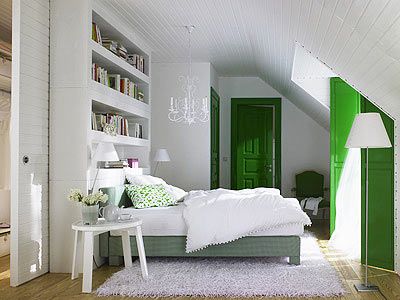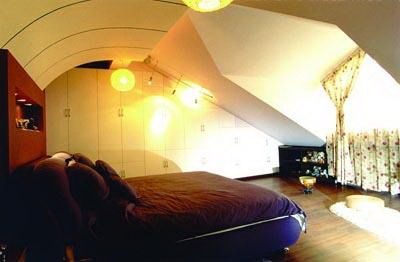 这样的卧室比较多:斜顶中凹陷一大块面积形成天窗(俗称老虎窗)。一般,这样的卧室室内空间面积不大,但斜顶凹陷的天窗开口很大,无论通风和采光条件都很好。