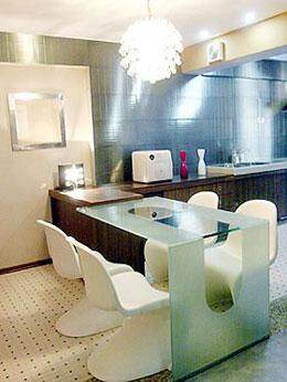 建议三:留出足够回转空间 餐桌椅在开放式厨房间的摆放,必须注意要留出烹饪操作空间,当餐椅拉出餐桌时,其椅背距橱柜要在一米以上,而一般的餐桌椅以一台四椅为例至少要占2米的宽度,再加上橱柜的进深,就要求开放式厨房的长或宽一边至少要在3.6米以上。
