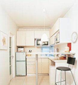 建议一:空间改造要巧 每个厨房空间在建筑时均会有防火墙或过顶梁等基本结构,对厨房隔墙改造时,一定要考虑结构的现有情况,做到“因势利导,巧妙利用”。如要改造的墙体上有过梁,可以保留此过梁,将它改造成“开放式厨房”的吧台灯光顶,而不能将它拆除,以免影响到建筑结构的稳定性。