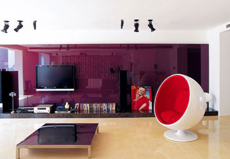 视听区域干净利落,没有多余的修饰,充分突显了刻意强调的功能。卸得多,装得少完全开放的空间里,四白落地,素净、淡然,却有股凛冽的豪爽,大块地砖将这种气质衬托得更加鲜明,背景墙虽然用了紫色,依然与外部活动区域保持感官上的统一。