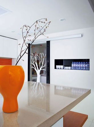 一间小的厨房间,由推拉门隔离。玻璃门上的白色树枝图案,与屋内的白色统一一致。