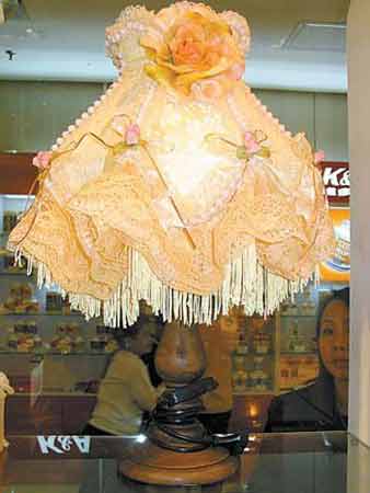 在某布艺店内,摆满了蕾丝纱或蕾丝布的窗帘、可爱的洋娃娃、色彩丰富的台灯饰品,还有各式各样的玩艺儿,像西式灯、篮子、储物箱……给人带来浪漫和惊喜。在家中玄关处摆放一面蕾丝花边的镜子,出门前梳理整齐,既美观又实用。看那个披上外衣的化妆盒在娇滴滴地向你撒娇。有蕾丝花边的灯饰体现华丽风情,最适合在客厅摆放,尤其是搭配布艺的沙发。这里的蕾丝西式灯罩都是精工制作,每件都好像在量身定做宫廷礼服,直立的灯饰也好似正要参加宫廷舞会的贵族,这样的灯饰为客厅增色不少。