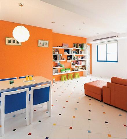 色彩鲜艳的橘色壁面、活泼的海军蓝窗框、靠椅与5×5彩色菱形马赛克地砖,以及白色的不规则展示架,使空间闲得活波鮮明。