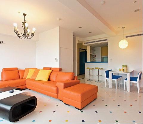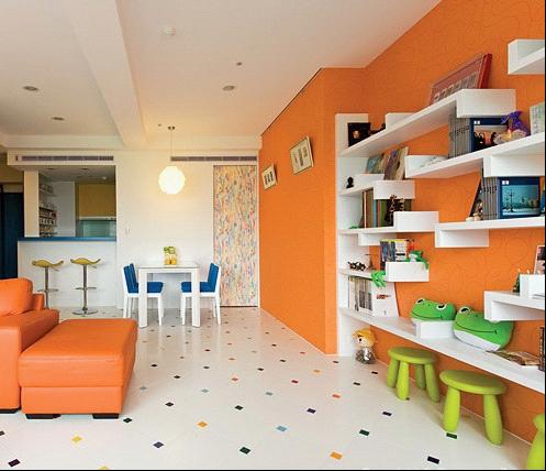 屋主一家四口都对艺术画画很感兴趣。因此,设计师大胆的运用橘色当作客厅主色,搭配5×5彩色马赛克瓷砖,以及白色的不规则的展示架、橘紅色沙发与黑、白、红等色的圆弧型茶几,让客厅空间显得格外与众不同。
