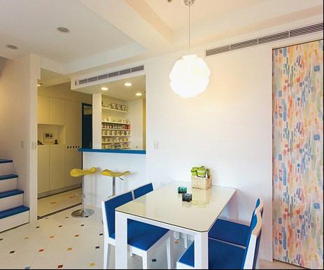 二楼的楼梯看到了吧!餐厅与厨房之间以吧台作为开门,便于传递食物。延续白、蓝的色彩基调,开放式的空间规划,让视觉感受轻松且宽敞,餐厅旁的水彩壁画为进入厨房的門。