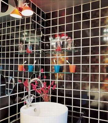 用颜色鲜艳、明快的小瓷砖组合,打破了卫生间的传统色调,使空间变得灵动起来。卫生间吊顶采用整面玻璃镶嵌,增强了空间感与瓷砖和灯光相结合,置身其中使人有一种进入梦幻世界的感觉。 装修知识 装潢www.shzh.net