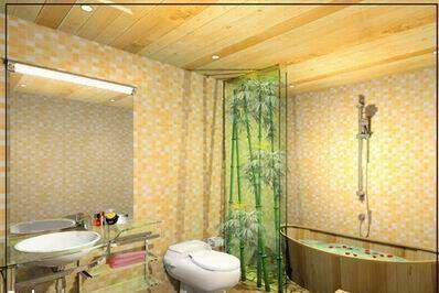 用玻璃隔断、桑拿板吊顶、玻璃马赛克,泡浴用的木桶就象放在沙滩上的一叶小舟,细长滴落的流水带着花瓣顺着光滑曲动的木桶流淌而下,缓缓从铺着鹅卵石的地漏中流走,这样的出浴图,透出一抹香艳。装修知识 装潢www.shzh.net