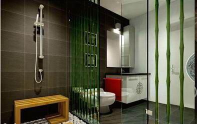 兼具掩饰面盆管道与使用储物功能的洗面台柜,玻璃隔断上附着的竹子沿袭了中国文化中坚韧挺拔的精神,玻璃隔断让空间干湿分离,脚下的鹅卵石既有园林情怀又起到了按摩的功效,精巧别致的空间布局赏心悦目。白色洁具在黑色的映衬下愈发显得纤尘不染。 装修知识 装潢www.shzh.net