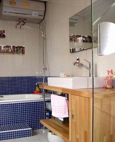 主卫生间墙面大块仿马赛克墙砖显的整个装饰很大气,但从细处看有马赛克的味道,局部欧宝百得利装饰砖把细部处理的更加完美,枫木本色台盆柜和兰色墙砖形成对比,使空间色彩层次更加丰富。设计的思路是简约的,但简约不是风格,也不是潮流,只是一种艺术手法。当然风格不是能随便拿来的,而应该是用不同的方法和用不同的风采表现出来。装修知识 装潢www.shzh.net
