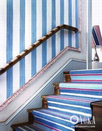 别出心裁的楼梯及墙面设计令人疑窦丛生,踏着五彩的地毯,楼梯的尽头是否有着童话般的神秘与浪漫?楼梯扶手上绘以彩色条纹,更能突显出木制感觉,并与整个空间融为一体。楼梯和走廊这样狭小的空间非常适合使用条纹装饰。 上海装潢网