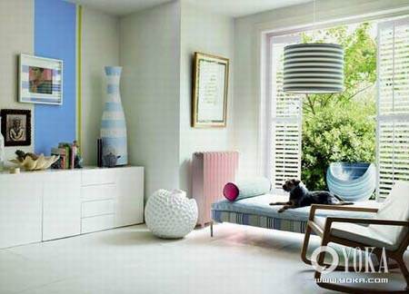 画中有画,耐人寻味。白底蓝条纹的相框巧妙地镶嵌于大幅蓝白垂直条纹样式的墙壁上,既形成水平和垂直方向的直接对比,又在颜色上相互呼应。对墙壁而言,也许只需涂上几条宽度各异的条纹图案,整个房间便能更加立体、生动起来。 上海装潢网