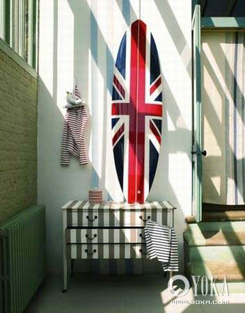 一个灰褐、白色相间的手绘抽屉柜,英国国旗纹样的冲浪板乃至条纹T恤衫和窗外斑驳的日光,都悄悄印证着条纹对空间强大的装饰力和塑造力。上海装潢网