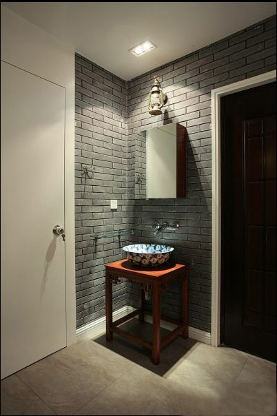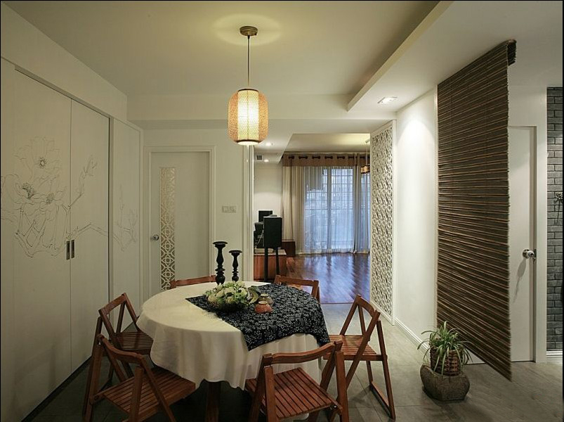 从餐厅里看不出这个家到底采用哪种风格。或许餐桌上方的中国风十足的吊灯隐隐现出这是个中式风格。壁橱上简洁的图案,雅致非常。