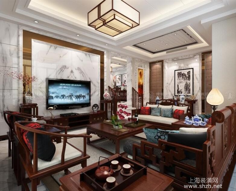 客厅 - 崇明县玉环路98弄天赐景城别墅装修新中式风格设计,上海腾龙别墅设计师祝炯作品,欢迎品鉴