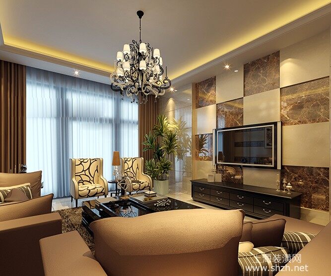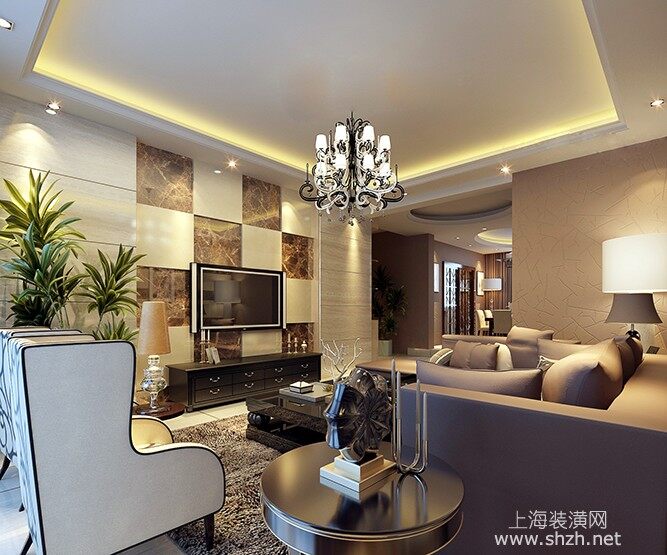 客厅 - 客厅电视背景墙用大理石作为装饰,运用不同石材拼接而成。