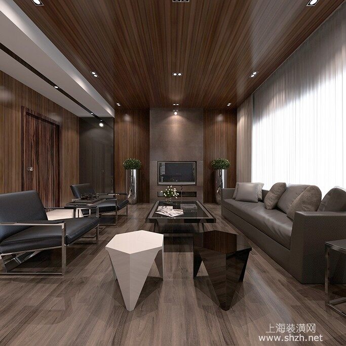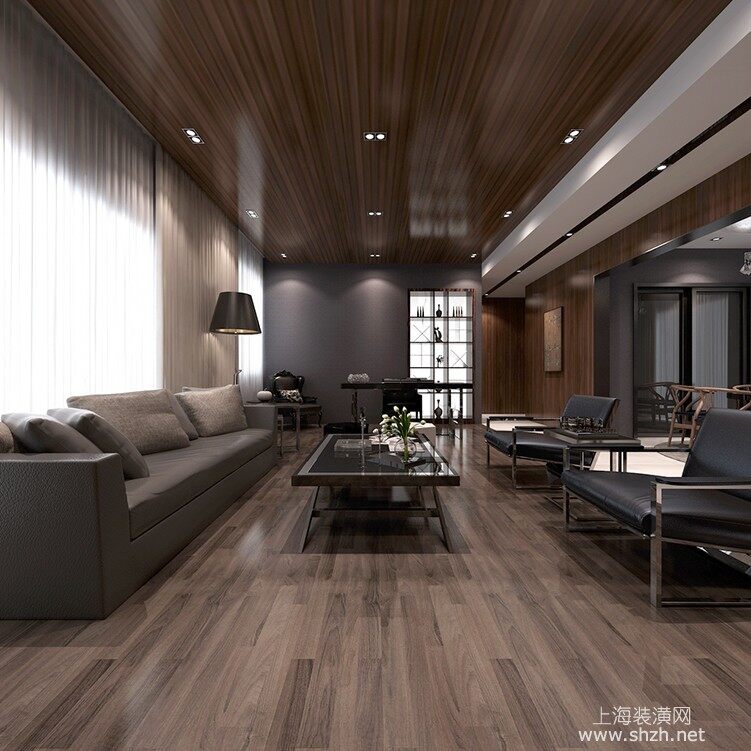 客厅 - 客厅设计的独特之处在于吊顶,将木饰面运用在顶面,使用深色家具使整个空间沉下来,一点也不压郁!